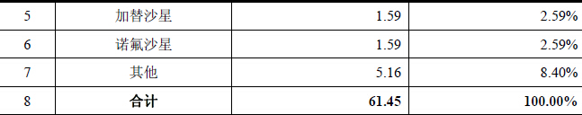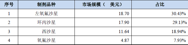 2012 年全球喹诺酮制剂类药物销售额合计为61.45 亿美元。按通用名计,2012 年左氧氟沙星20制剂全球销售额为18.7亿美元,在所有喹诺酮类品种中列第一位,环丙沙星制剂和莫西沙星制剂紧随其后,销售额分别为17.90 亿美元和11.64 亿美元。上述3 个品种全球年销售额均超过10 亿美元,属于“重磅炸弹”级产品。2012 年,主要喹喏酮品种销售额及市场份额如下: