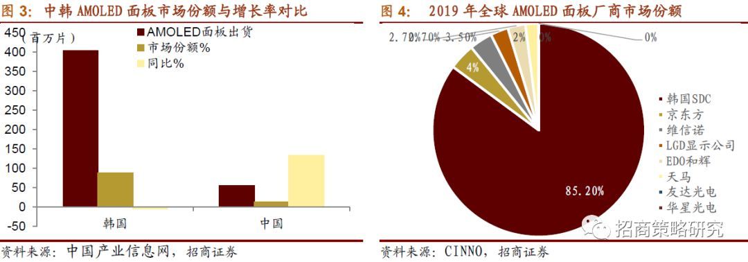 根据日前CINNO发布的报告显示,2019年全球AMOLED智能机面板出货约4.59亿片,同比增长3.6%。其中韩系面板厂出货约4亿片,市场份额高达87.9%,同比降低3.8%;而中国AMOLED面板厂2019年出货量约5600万片,市场份额12.1%,尽管还有很大差距,但出货同比增长133.5%。在具体出货厂商中,三星凭借十几年的研发经验,占据了高达85%的市场份额;京东方受益于和华为、OPPO、Moto等品牌的合作,2019年出货量达1800万片,出货同比增长343.9%,市场份额4.0%,仅次于韩国三星。此外,紧随其后的还有中国的维信诺、和辉、天马、友达光电、华星光电等企业。中国企业在AMOLED市场扮演着越来越重要的角色。